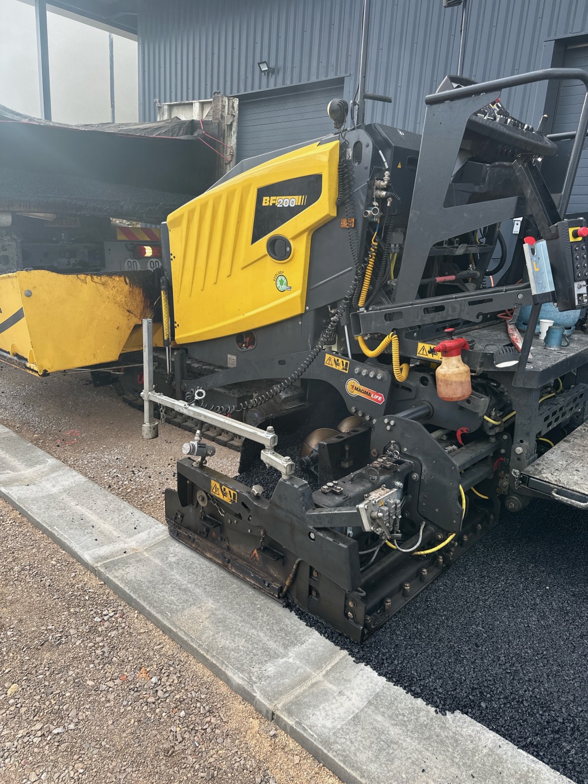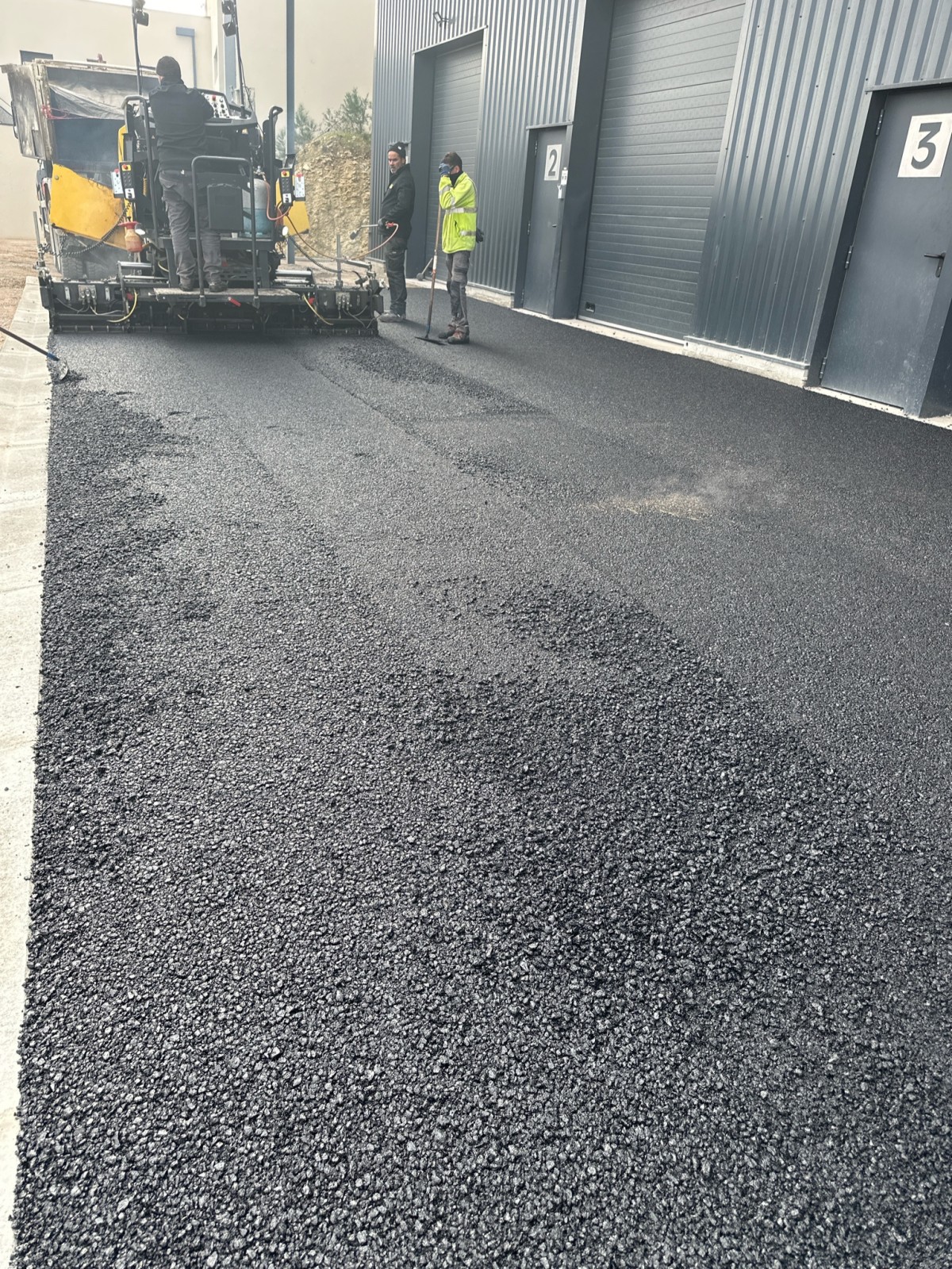 avec finisseur après un préparation du sol et pose des CC1 et des bordures T2
